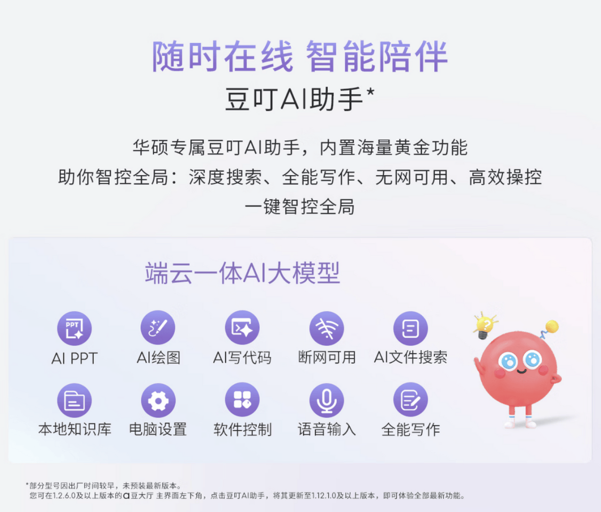 华硕a豆14 Air 2026做为本年轻薄本市场的沉磅新品,通过MIL-STD 810H高尺度质量认证,此次焕新万万别错过!日常办公、多使命处置、轻度视频剪辑都能流利运转,白条6期免息、晒单返100E卡等福利更是诚意十脚。其全新升级的豆叮AI帮手取桌宠实现双AI融合——一键即可挪用智能对话、文档辅帮、AI画图取PPT生成等丰硕功能。这块屏幕具有120Hz高刷新率、100% P3广色域、1100nits超高峰值亮度,